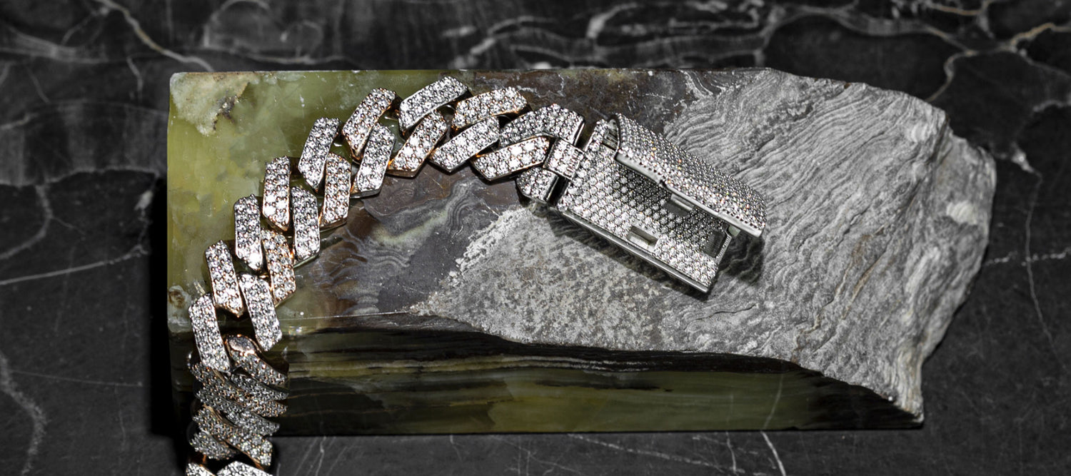 detail of clasp of 18k white gold coated mini prong chain necklace with hand-set micropavé stones in white