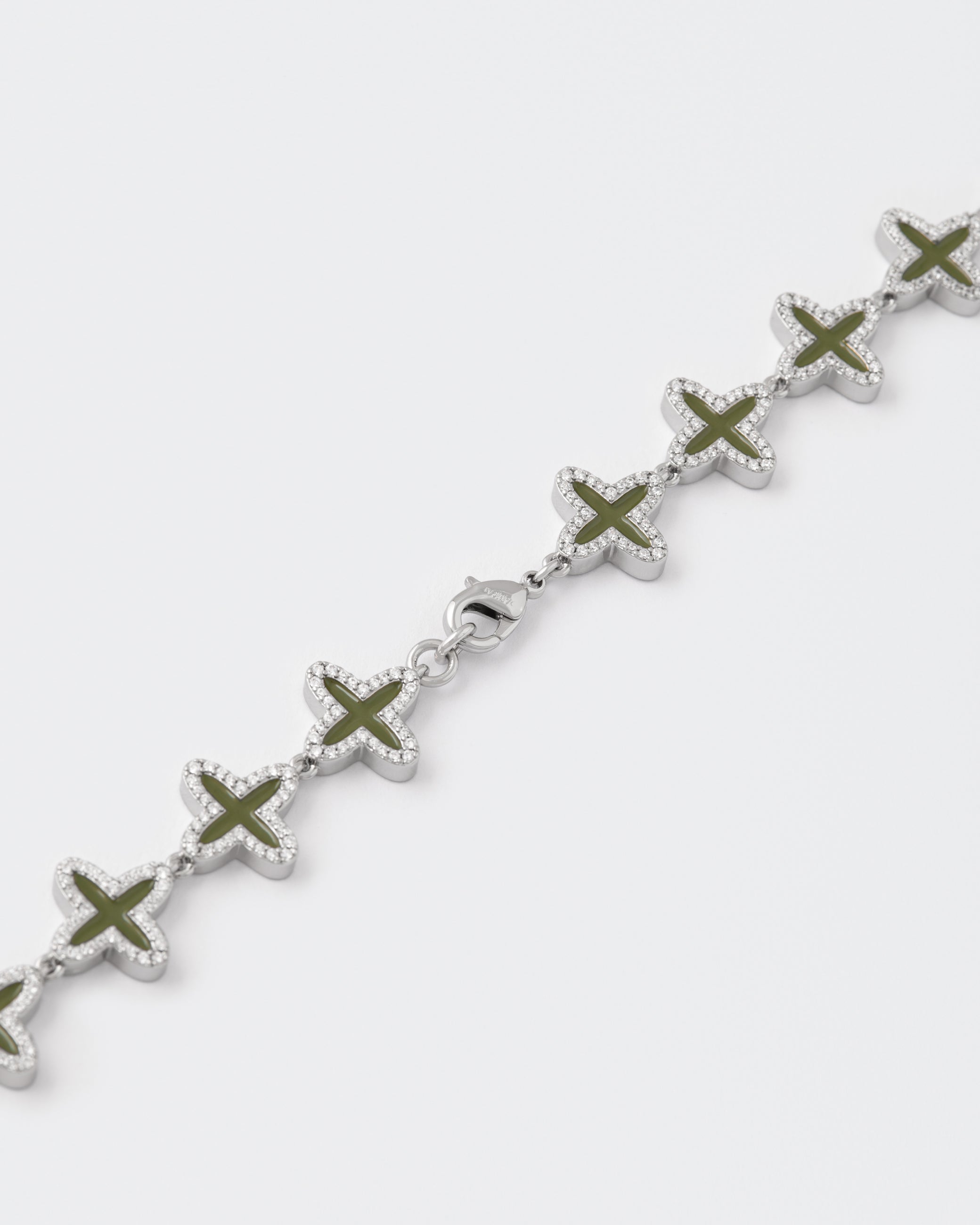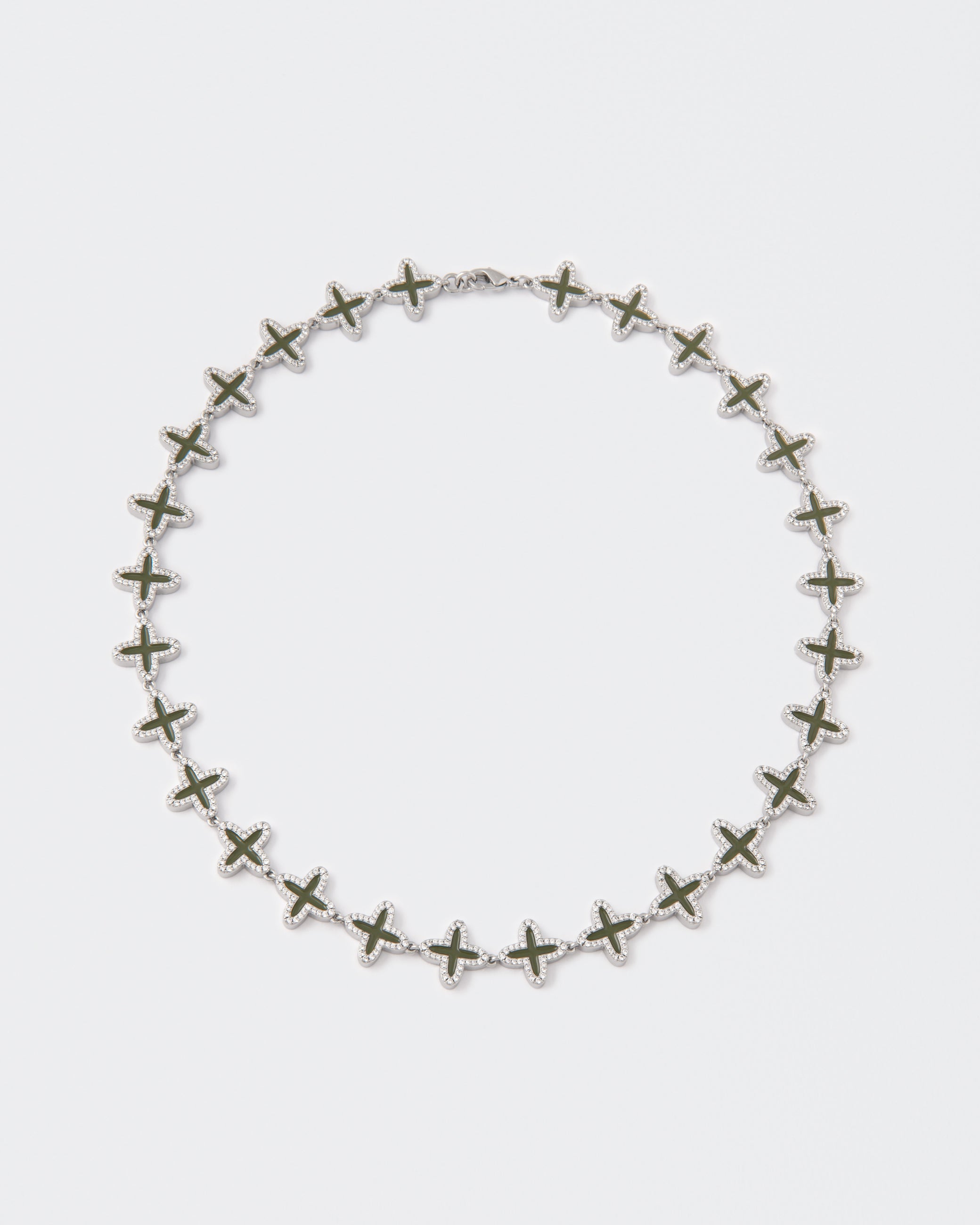Collana tennis clover rivestita in oro bianco 18kt con micropavé di pietre bianco diamante. Smalto a caldo verde oliva steso a mano e chiusura a moschettone con logo.
