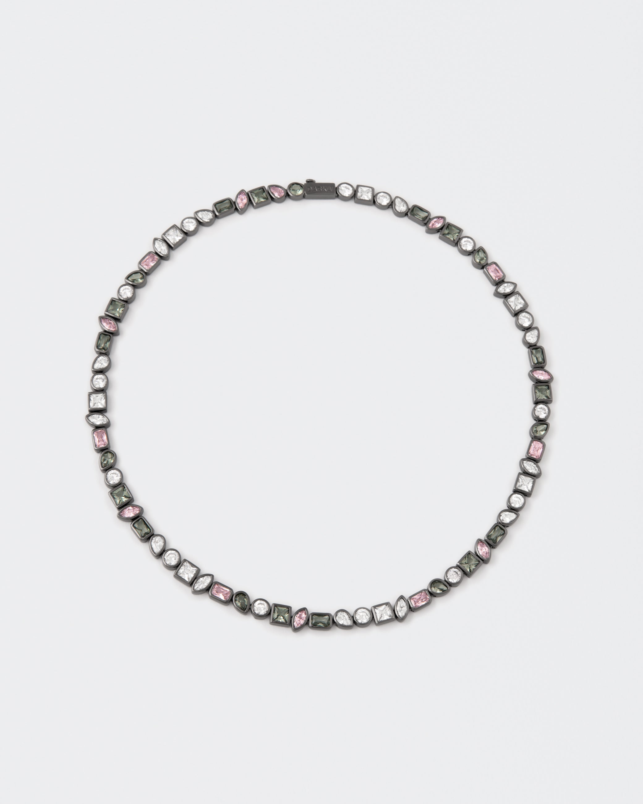 Collana Mixed bezels rivestita in PVD Vanta Black. Combinazione di pietre multi-taglio ad incassatura invisibile taglio quadrato, rotondo, goccia e marquise in colore bianco diamante, diamante rosa e verde tormalina. Chiusura a scatto con logo.