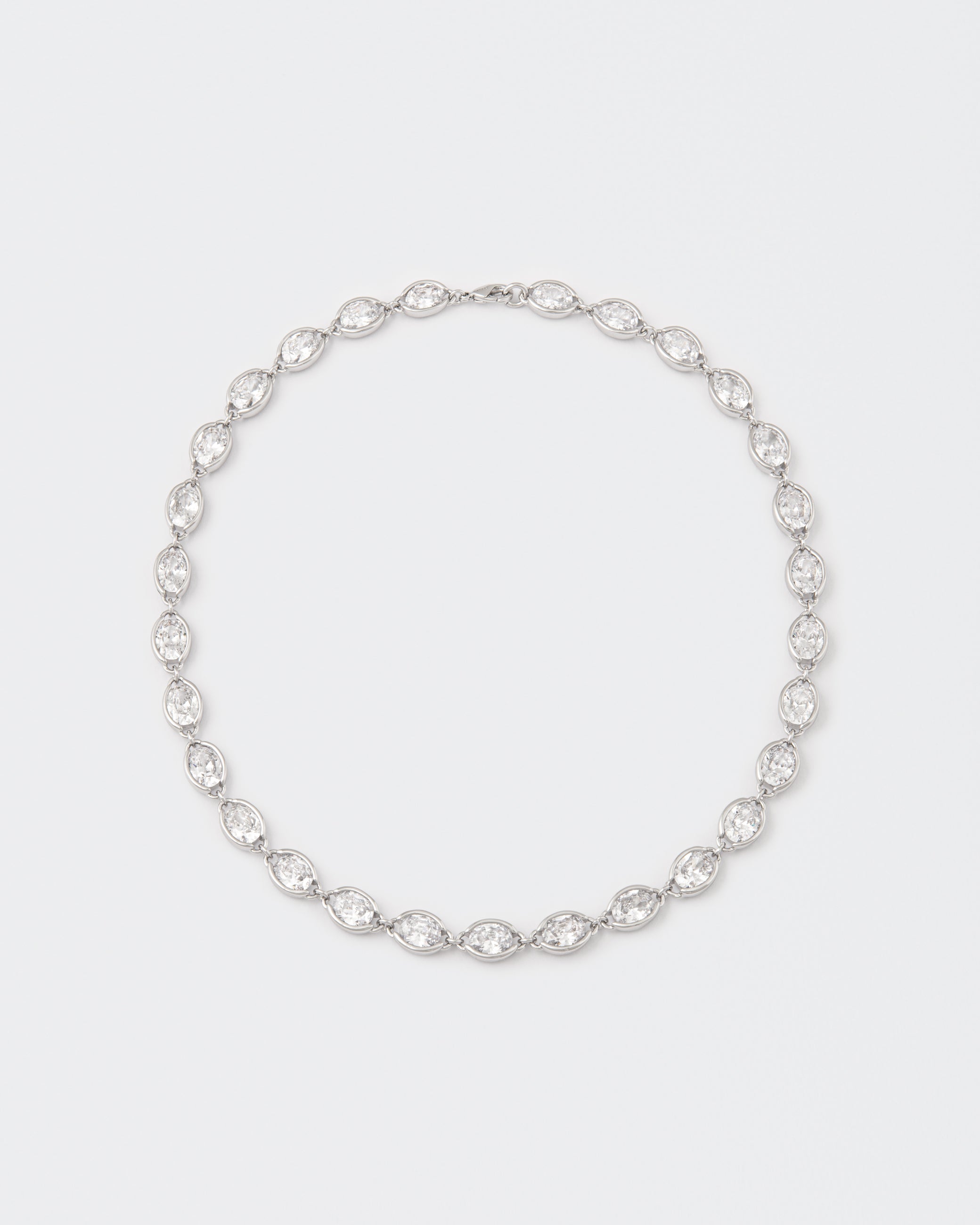 Anchor white necklace with 18kt white gold coating and hand-set oval stones in diamond white color. Custom made open bezels and polished metal. Lobster clasp closure with logo engraved.