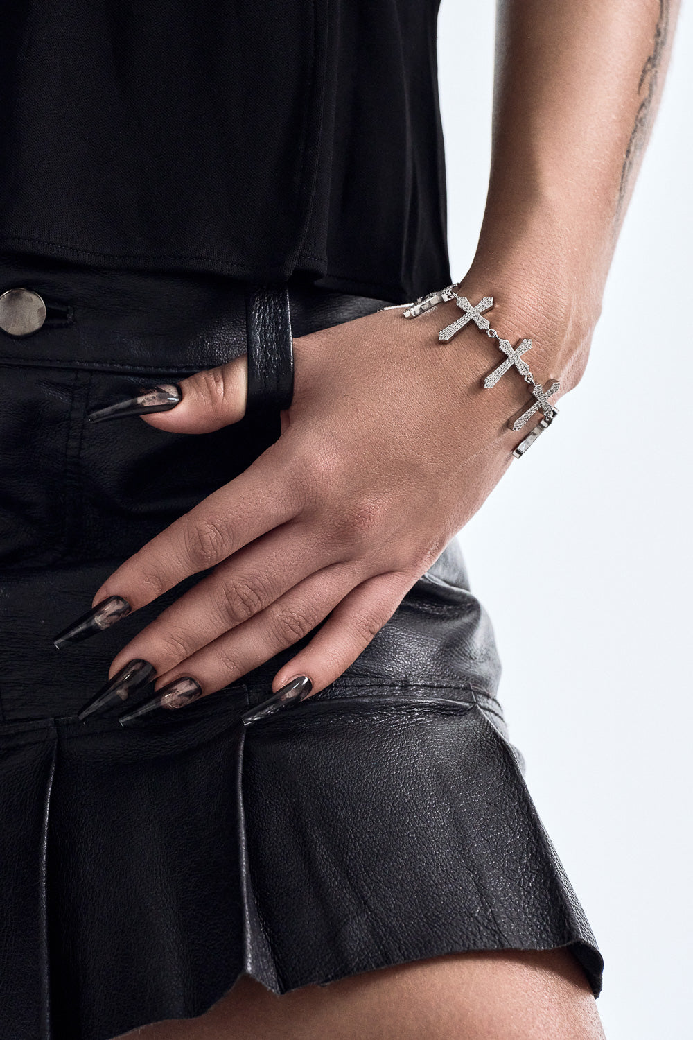 Cross tennis bracelet with 18kt white gold coating and micropavé of hand-set brilliant cut stones in diamond white. Finely polished gothic crosses and lobster clasp with logo.